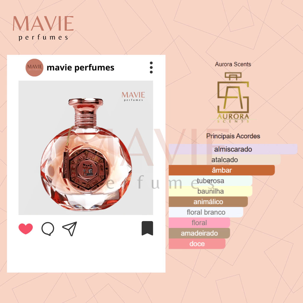 Cleopatra de Aurora Scents é uma fragrância poderosa e sofisticada que celebra a força e a sensualidade feminina, envolvendo a pele com um toque luxuoso de flores brancas, âmbar e baunilha dignos de uma rainha.