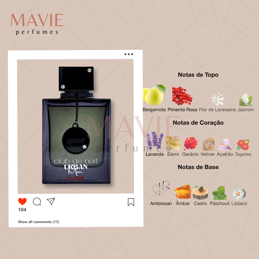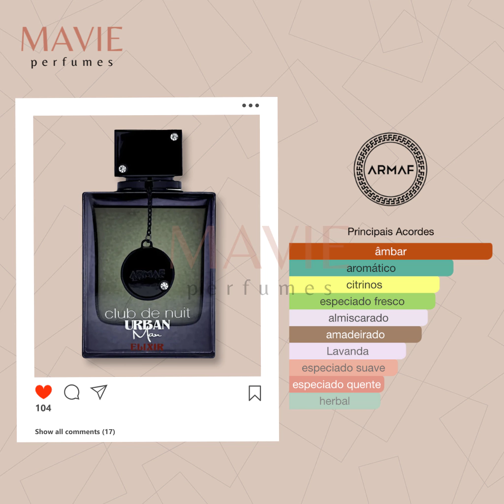 Club de Nuit Urban Elixir é um perfume amadeirado aromático que combina frescor, especiarias e notas intensas, resultando em uma fragrância poderosa e versátil, ideal para diversas ocasiões.