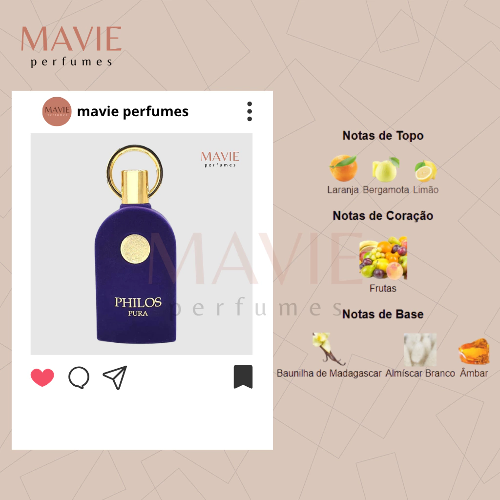 Philos Pura é uma fragrância exclusiva e refinada, é a escolha perfeita para aqueles que buscam elegância e sofisticação em cada borrifada. Com uma combinação harmoniosa de notas frescas e envolventes, Philos Pura é ideal para o dia a dia ou ocasiões especiais, destacando-se pela sua longevidade e presença marcante.