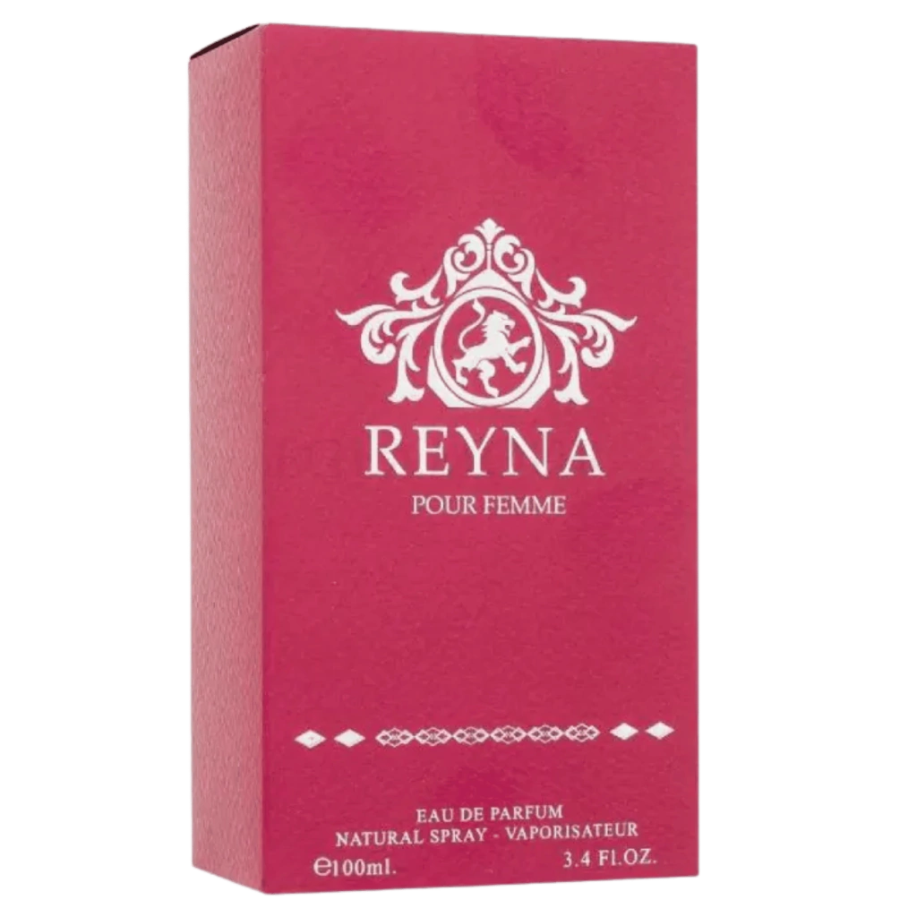 O frasco apresenta um design elegante em tom rosa vibrante, com acabamento fosco e detalhes prateados, refletindo a feminilidade e o charme da fragrância. Reyna é uma excelente opção para mulheres que buscam uma fragrância doce, sofisticada e envolvente.