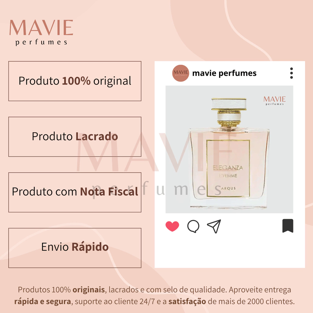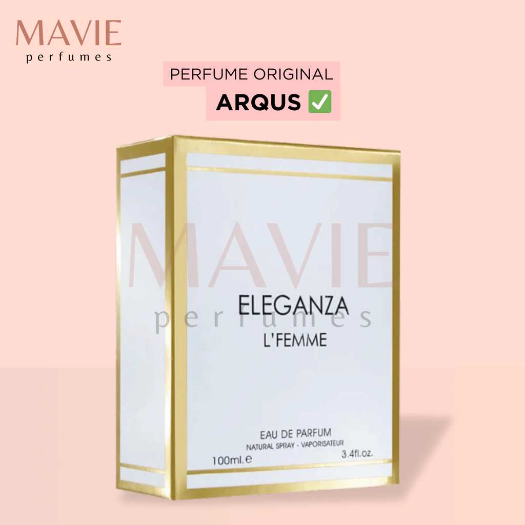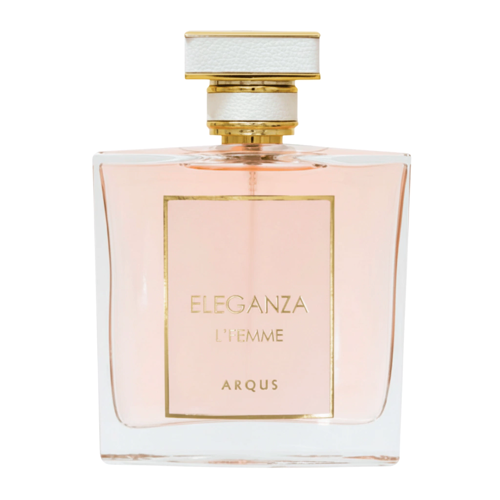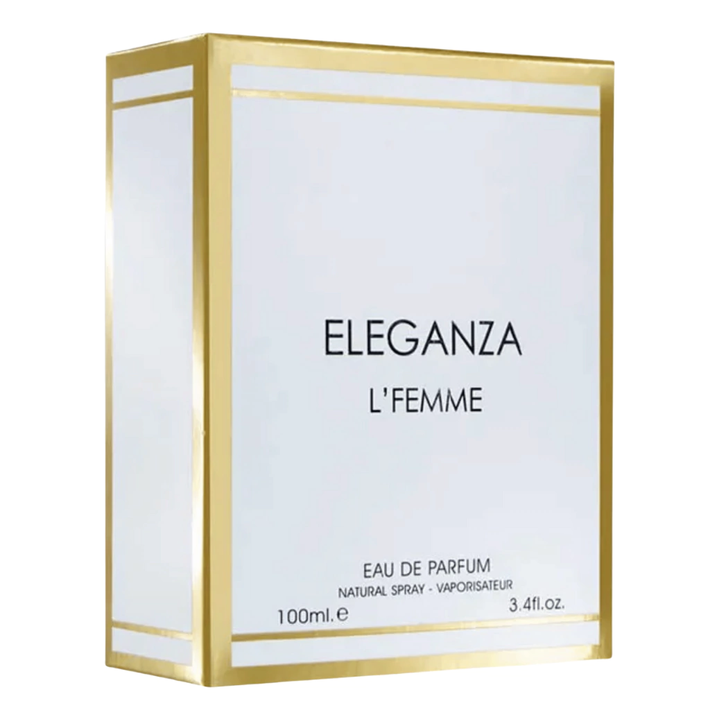 Eleganza L'Femme é uma fragrância refinada que mistura doçura, calor e notas florais elegantes, com uma base rica que dá profundidade, ideal para quem gosta de perfumes marcantes.