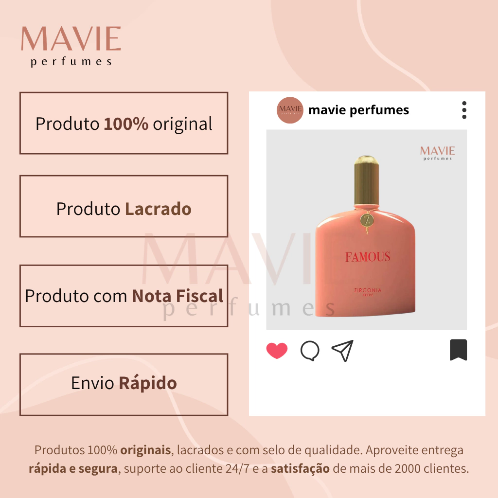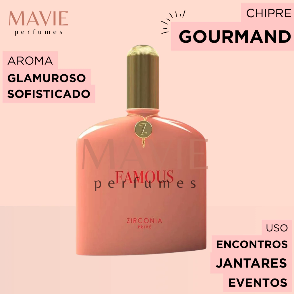 O Zirconia Privé Famous é um perfume feminino da família olfativa Chipre Gourmand, inspirado na sofisticação e sensualidade. Sua composição combina notas cítricas, florais e doces, criando uma fragrância envolvente e marcante.